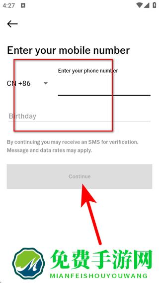 4、在手机号码输入页面中,输入手机号码,点击Continue,按照后续提示完成账号注册操作。