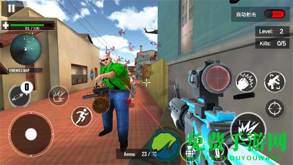 1、战斗时,利用左侧虚拟摇杆移动,右侧瞄准射击,针对不同敌人如持重武器的胖子敌人,精准射击其要害,快速消灭。