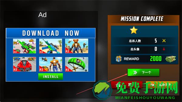 4、每关消灭指定数量的敌人如总杀人数5后,即可达成MISSIONCOMPLETE,获取奖励,点击下一个进入下一关继续挑战。