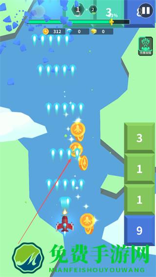 1、操控飞机在关卡中飞行,撞击数字方块以消除它们,同时收集金币。