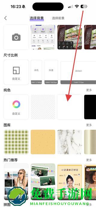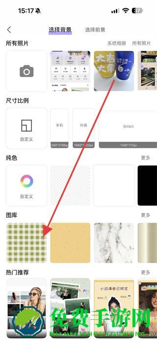 2、在选择背景板块中,从所有照片、纯色、图库、热门推荐等分类里挑选合适的背景样式。