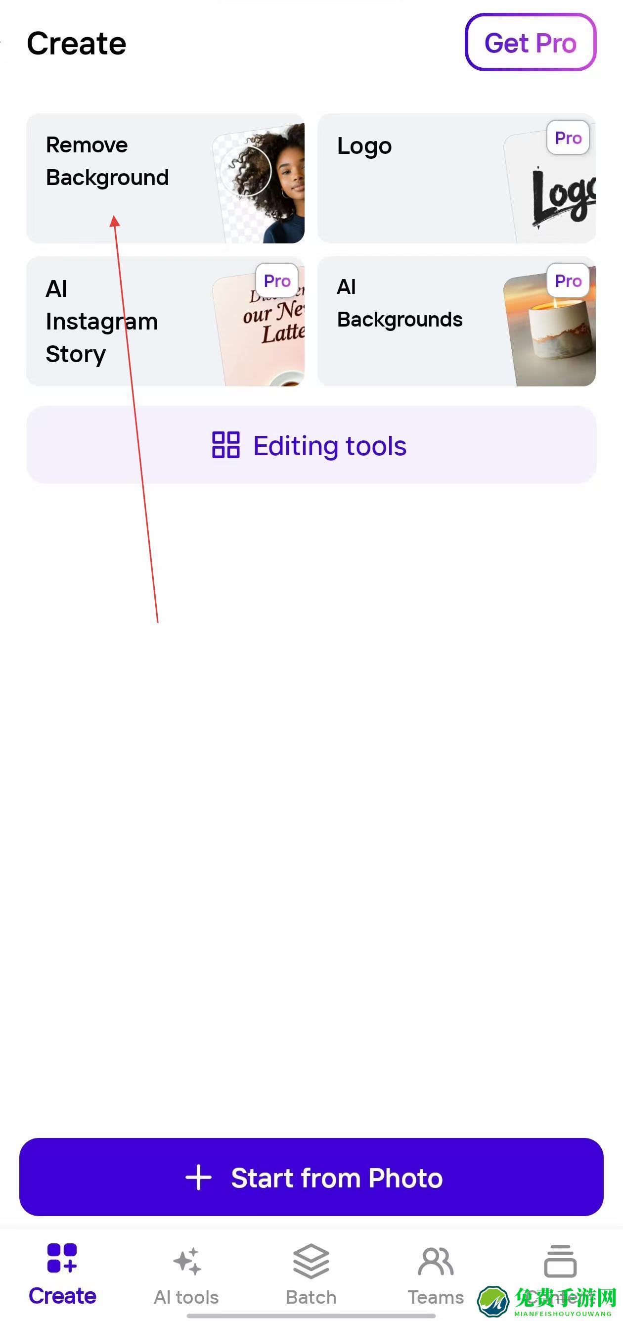 1、打开Photoroom APP,进入Create页面,点击Remove Background功能选项。