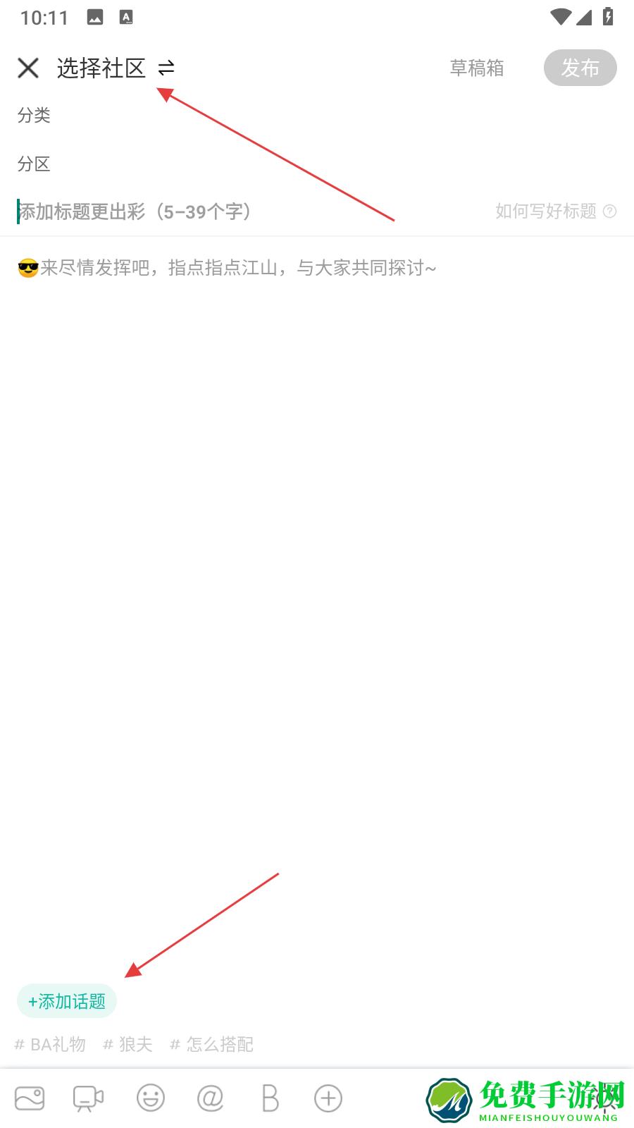 2、在发帖编辑页面先点击选择社区选择要发布帖子的社区分类和分区,然后输入帖子标题和内容。