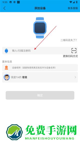 4、输入或扫描电话手表的注册码,完成基本信息设置后点击确定即可。