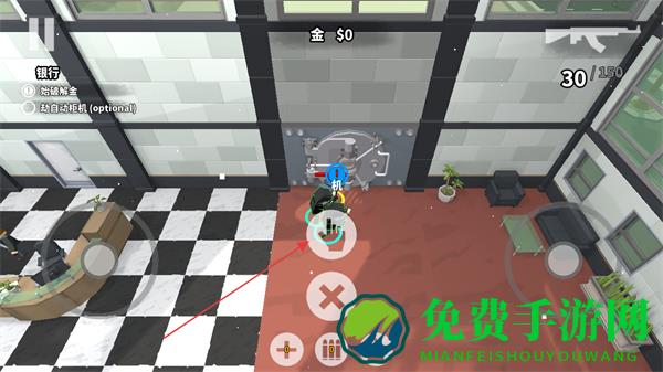 1、进入银行,点击互动按钮开始破解金库,同时注意周围的安保人员。