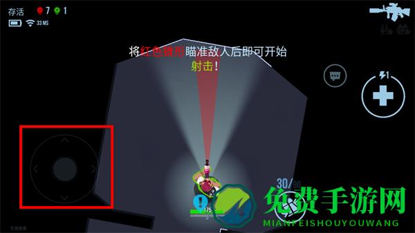 1、在子弹回声游戏界面,通过左侧虚拟摇杆控制角色移动,将红色锁狙瞄准敌人后即可开始射击。