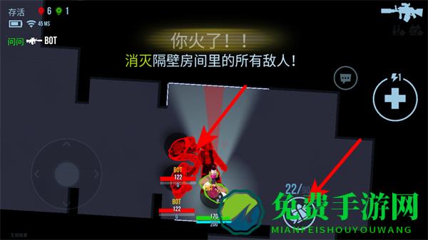 3、消灭敌人后会触发“你火了”状态,需消灭隔壁房间里的所有敌人,可使用右侧技能按钮辅助战斗。