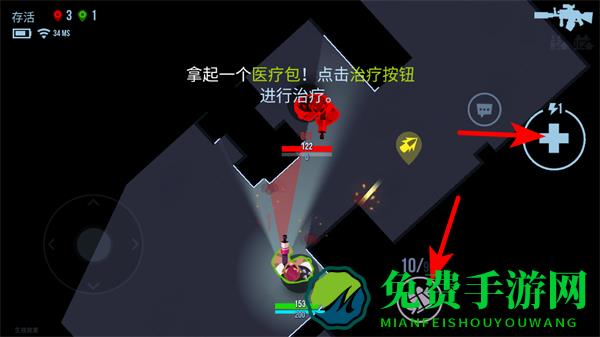 4、需注意血量,拿起医疗包后点击治疗按钮可进行治疗,合理利用资源完成游戏任务。