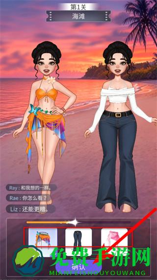 4、在海滩关卡中,选择合适服饰后点击确认按钮,完成穿搭并参与比拼。