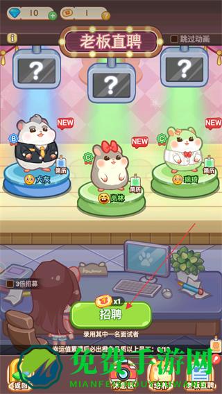 3、点击下方招聘按钮,消耗抽奖券进行员工抽奖,从上方的三个员工中抽取其中一个。
