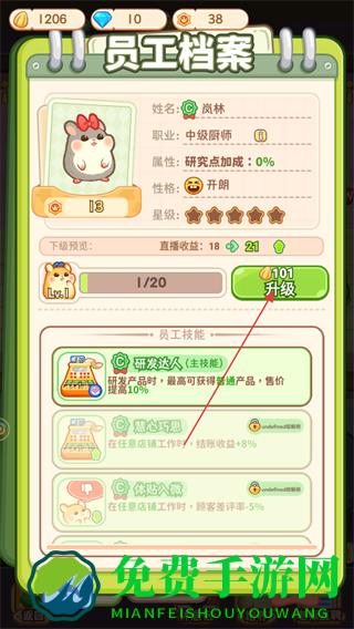 4、在员工档案中可以看到抽中的员工信息,点击升级可以花费瓜子币进行等级提升。