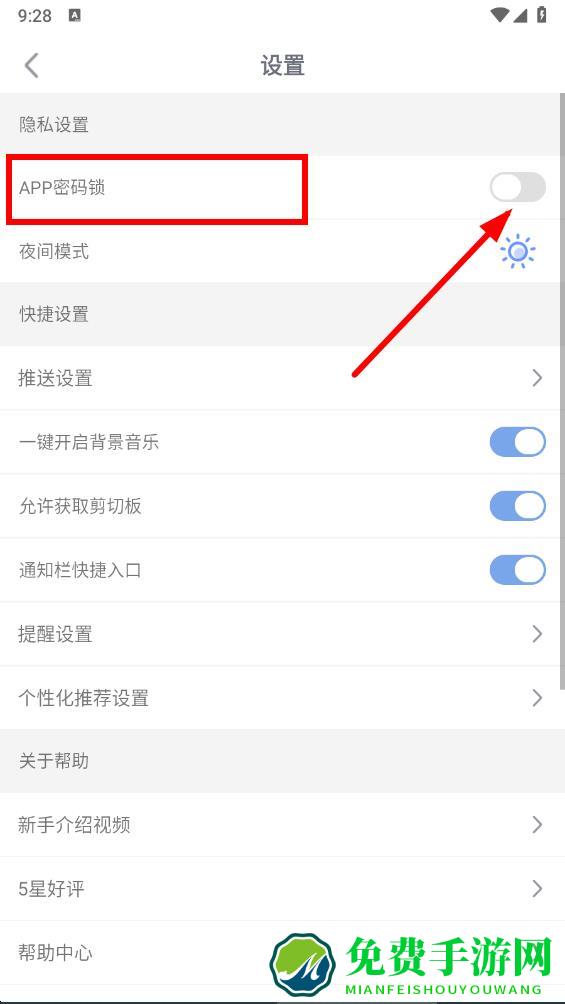 3、在设置页面里,找到APP密码锁选项,点击其右侧的开关按钮将其开启,准备进行密码设置操作。