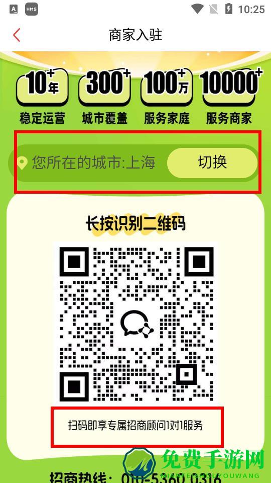 4、进入新页面后可按需切换所在城市,并可通过长按识别二维码获取专属招商顾问1对1服务以完成后续入驻操作。