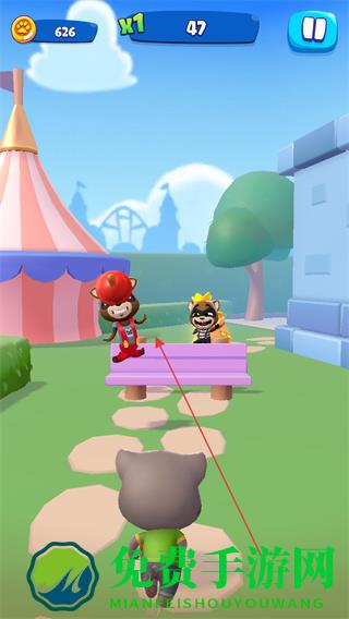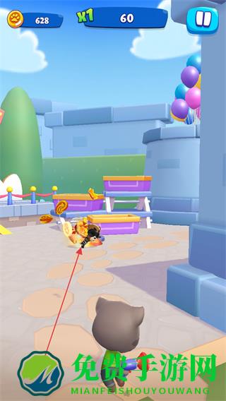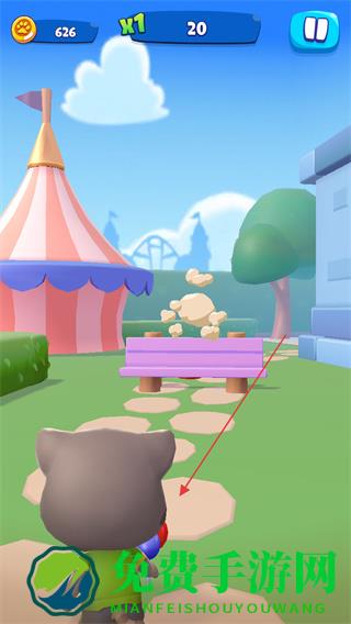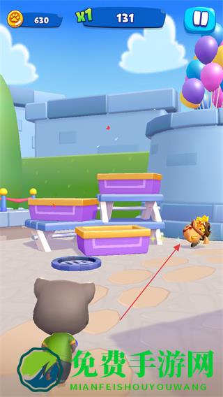 1、操控汤姆猫在公园场景移动,瞄准目标发射道具,击碎障碍物。