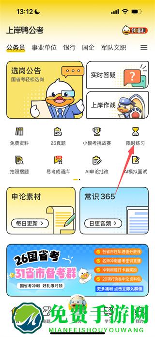 1、在上岸鸭公考首页,点击限时练习选项,进入限时练习页面。