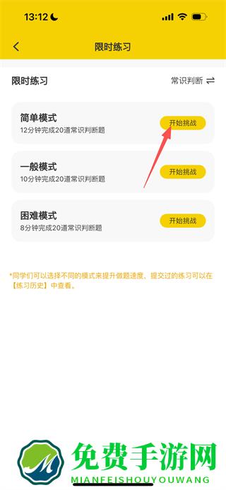 2、在限时练习页面,选择练习模式,点击开始挑战按钮,进入答题页面。