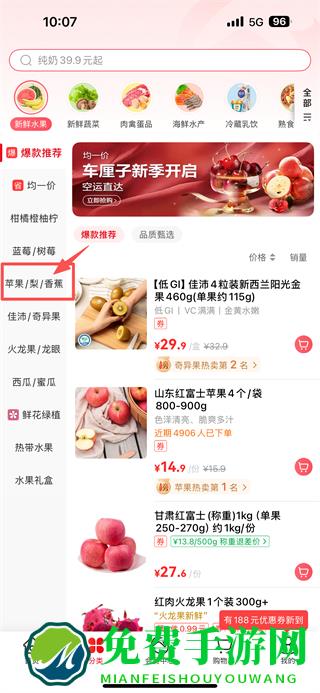 2、在分类页面,点击苹果/梨/香蕉分类,进入苹果类商品列表页。