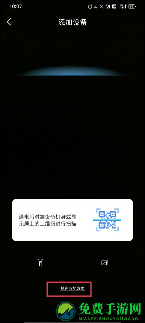 4、将摄像机进行通电后,就可以将手机的扫描框对准设备机身或显示屏上的二维码进行扫描,如果想换一种添加方式可以点击下方的“其他添加方式”。