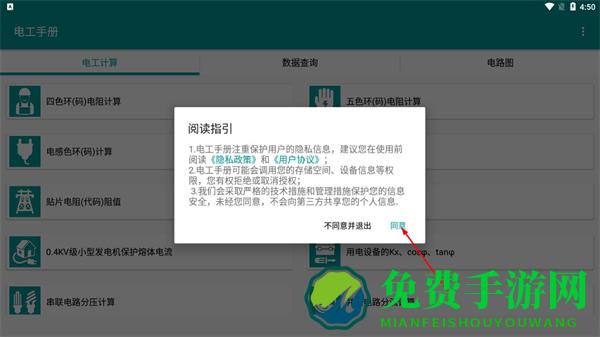 1、在电工手册阅读指引弹窗中,点击同意,进入电工手册主界面。