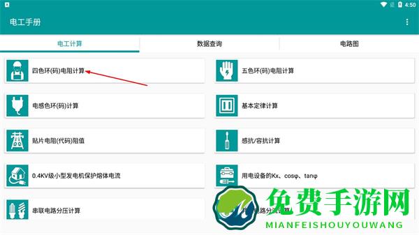 2、在电工计算页面,点击四色环码电阻计算,进入四色环电阻计算器页面。
