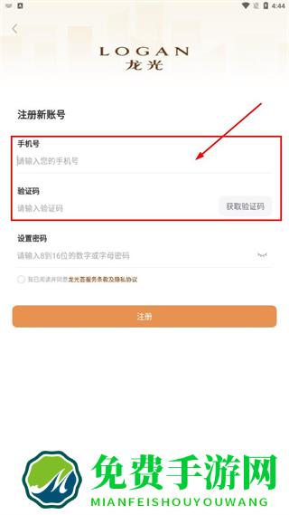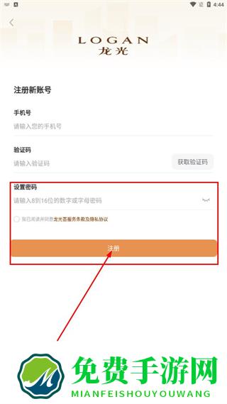 5、勾选已阅读并同意龙光服务条款及隐私协议后,点击注册,完成账号注册操作。
