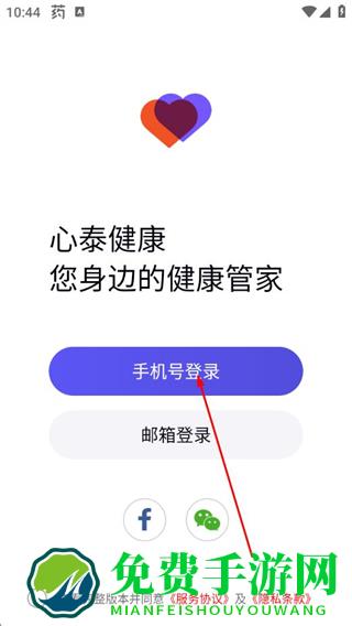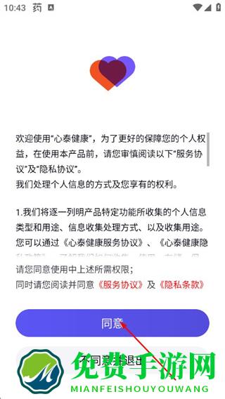 1、打开心泰健康APP,在服务协议与隐私协议弹窗中点击同意。