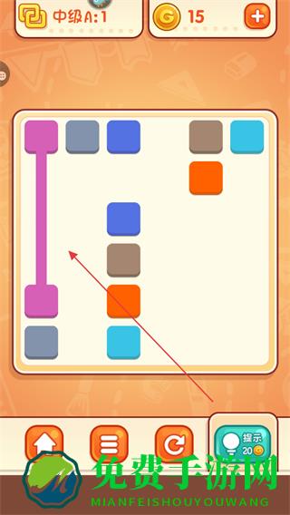 1、观察紫色方块位置,规划垂直路径,连接相同紫色方块,完成连线。