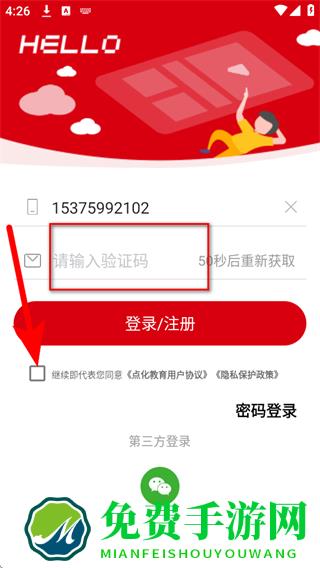 3、点击发送验证码按钮,输入收到的验证码,勾选继续即代表您同意点化教育用户协隐私保护政策。