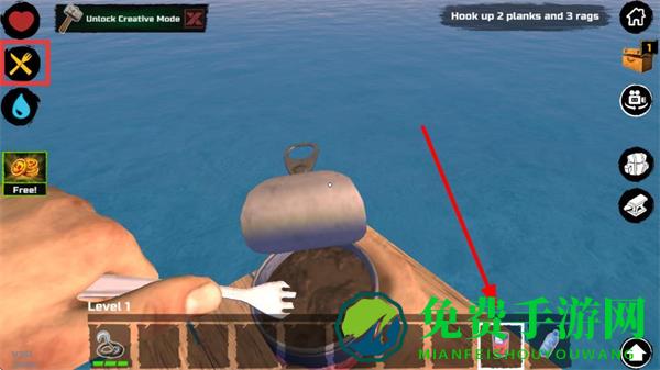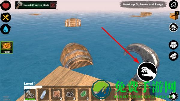 1、钩子按钮点击可发射钩子,瞄准海上的木桶、木板等资源发射,点击回收钩子按钮可将勾中的资源拉回木筏。