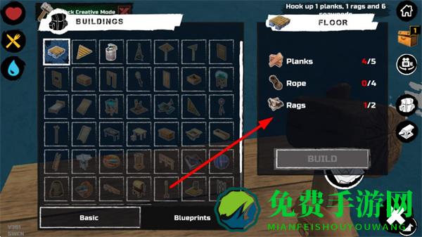 3、建造界面可选择建造的建筑,如地板、工具台等,消耗对应的木板、绳子、破布等资源进行建造,需根据需求优先建造关键建筑。