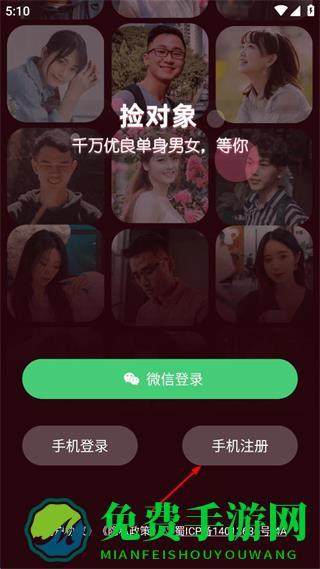 1、在捡对象APP登录界面点击手机注册,进入注册页面。