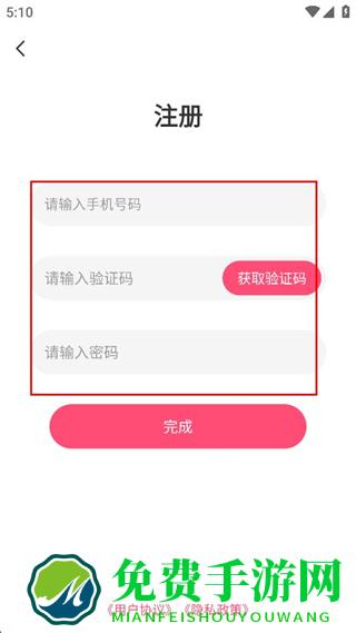 2、在注册页面输入手机号码,获取并输入验证码,设置密码后点击完成。