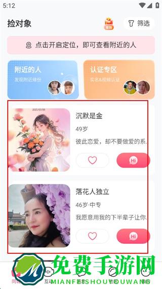 捡对象app为单身人士搭建可靠交友桥梁,平台严格审核用户身份信息,确保每位用户信息真实可靠,让交友更安心,支持自由社交互动,还能帮亲友牵线搭桥赚取佣金,一举两得,用户填写兴趣爱好后,系统会快速精准匹配志同道合的另一半,同时支持在线实时聊天,方便深入沟通了解,功能实用、操作便捷,助力高效脱单,有婚恋需求的朋友快来下载使用。