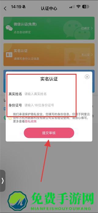 4、在填写框中输入真实姓名和身份证号,点击提交审核,即可完成捡对象APP的实名认证流程。