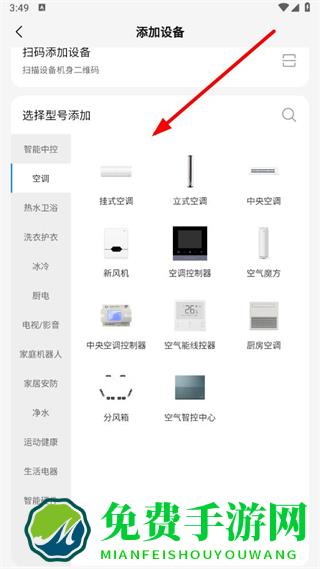2、在添加设备页面选择需要添加的设备,进入扫码添加设备页面。