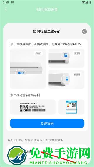 3、在扫码添加设备页面点击手动添加选项,进入手动添加设备流程。