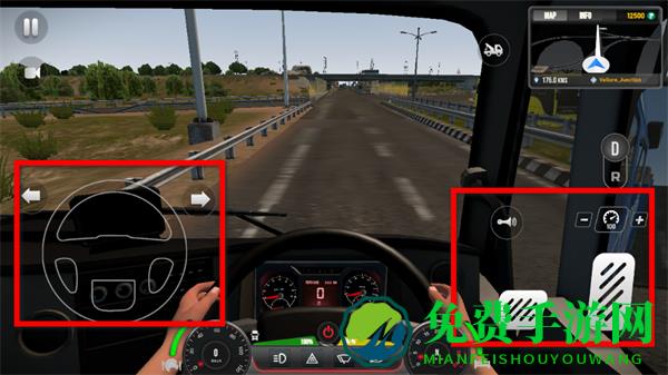 2、通过左侧的方向控制按钮操控卡车的转向,右侧的加速和刹车按钮控制卡车的速度。