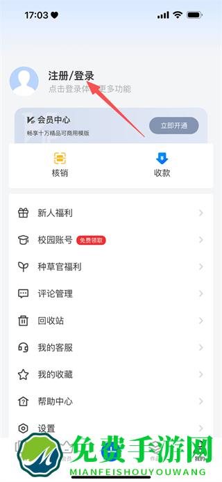 2、在个人页面,点击注册/登录,进入登录选择页面。