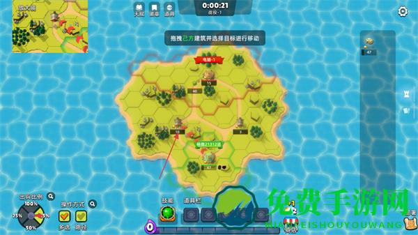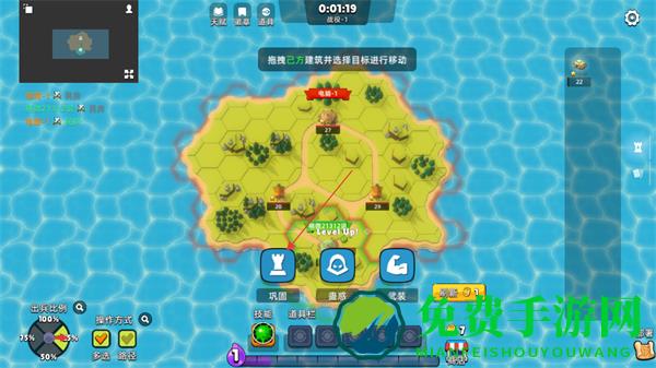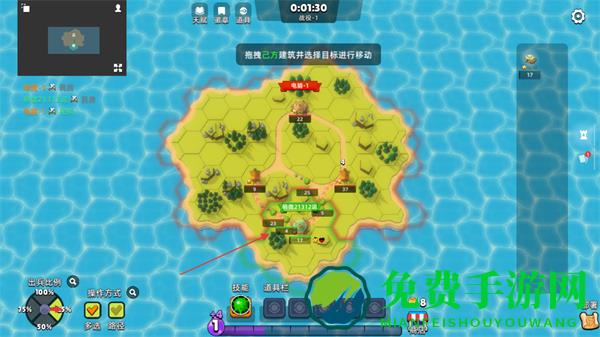 1、在岛屿地图上,拖拽史莱姆并选择目标进行移动,抢占领地和资源点。