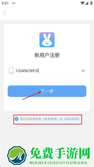 3、勾选我已阅读并同意使用条款和隐私政策,点击下一步按钮。