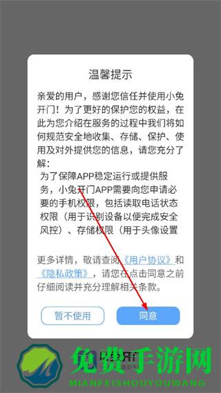 1、打开小兔开门,在弹出的提示页面,点击同意按钮。
