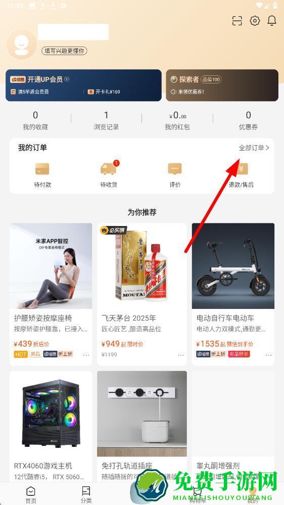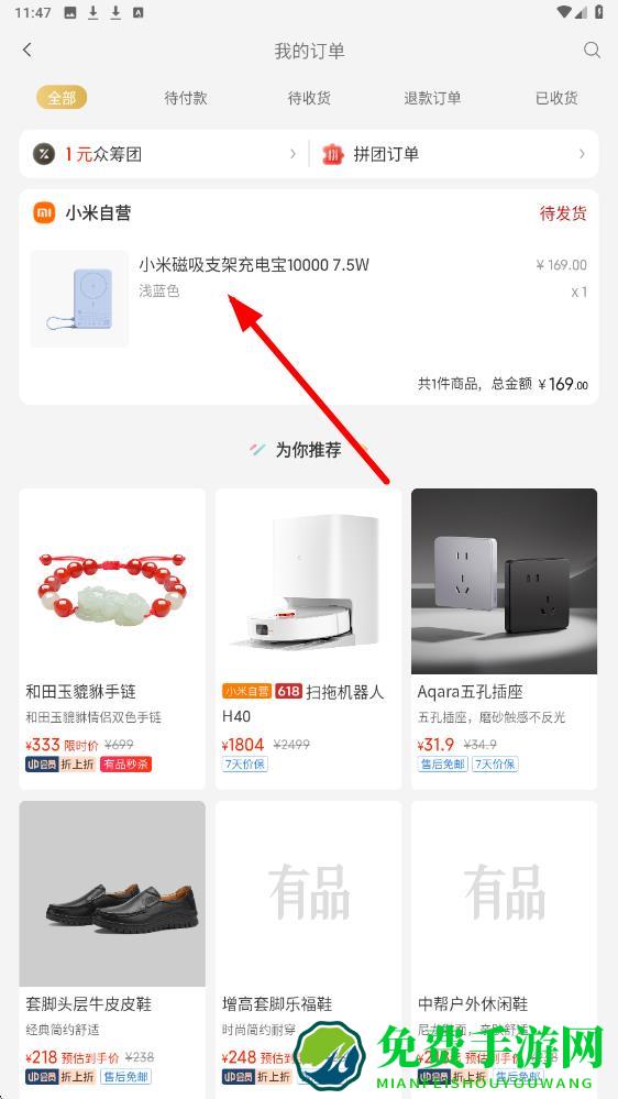 1、打开小米有品商城app,点击底部导航栏中的我的选项,点击全部订单按钮,查看所有订单信息。
