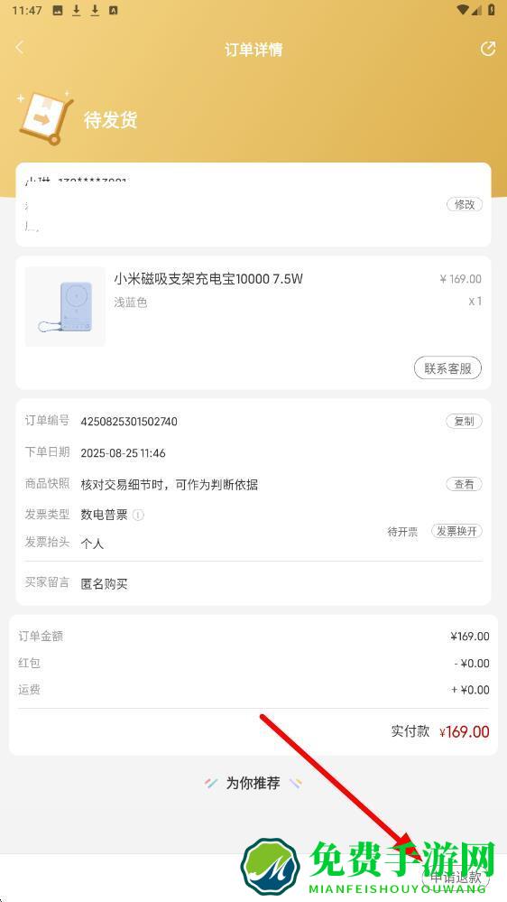 3、在订单详情页面,下滑找到申请退款按钮,点击该按钮,按照页面提示选择退款原因、填写退款说明等信息,确认无误后提交退款申请即可。