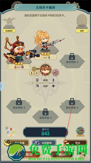 1、在主线关卡编排界面,布置角色阵容,调整前排、后排站位,确认后点击确认进入战斗。