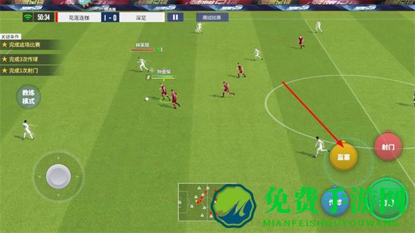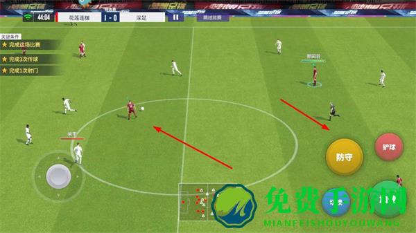 1、在比赛中操控球员带球推进,通过左侧虚拟摇杆调整方向,寻找进攻机会。
