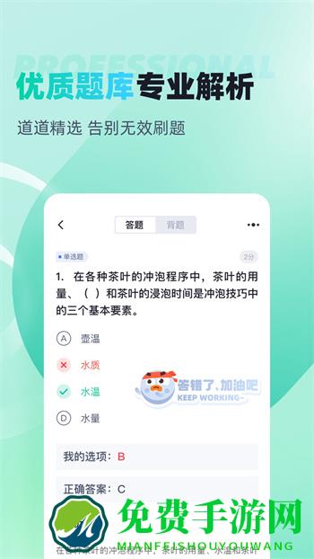 茶艺师题库内含考点练习,通用卷以及地区卷模拟练习,以及按照固定考试比重的随机式的抽题的真题考场,成绩单实时记录考试数据,一点一滴的反馈考生近期学习状态以及自我正确率的提升,给予考生通过考试的信心。