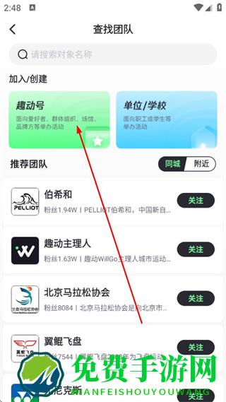 3、在查找团队页面点击趣动号,进入创建趣动号页面。