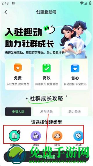 4、在创建趣动号页面选择创建类型,点击申请创建。