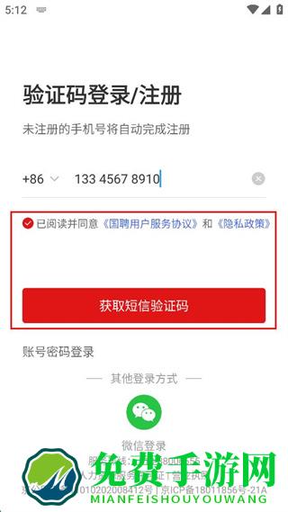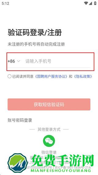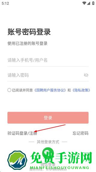 1、打开国聘软件,在账号密码登录界面点击验证码登录/注册。