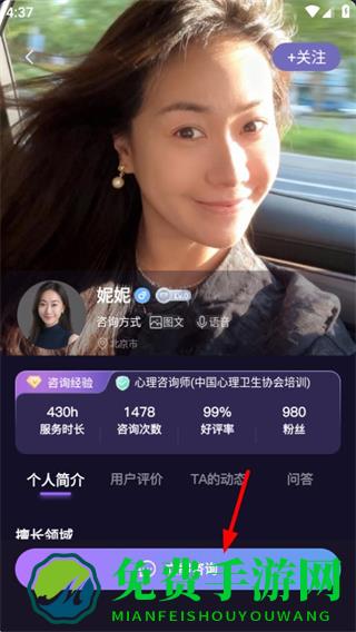 2、在咨询师列表页面,选择目标咨询师如妮妮,进入该咨询师的详情页面。